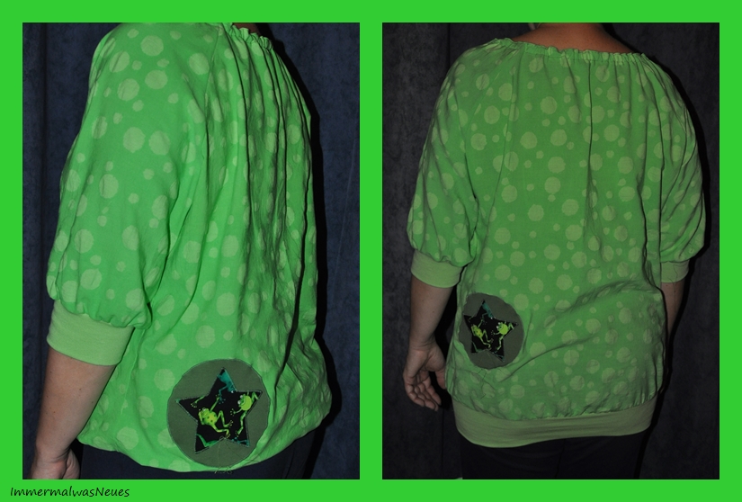 Ein bisschen Schnickschnack musste auch noch sein und so haben noch ein paar Frösche mit meinem wohlgehüteten Lieblingsstoff Platz auf Emma gefunden. Und weil ich Sterne und Punkte und grün liebe sieht es jetzt so aus: